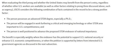 且NIW的审核标准认为拥有理工博士学位是一个强有力的积极因素。这是Y先生比之同行特别明显的一个优势。(具体请见以下截图)