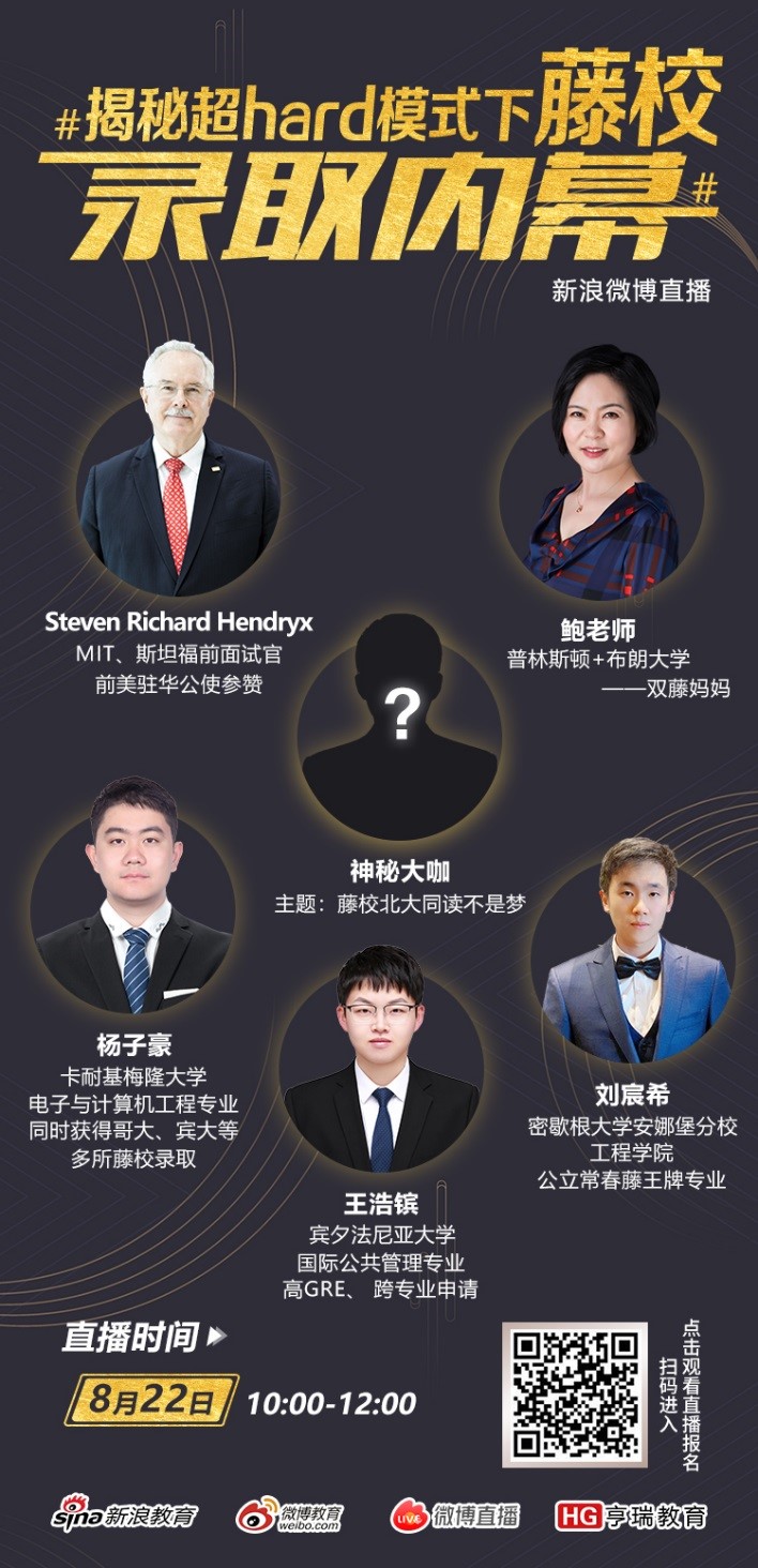 8月22日上午10:00-12:00,亨瑞教育携手新浪教育,策划了“揭秘超hard模式下的藤校录取内幕”连麦直播。本次直播嘉宾阵容强大:2位教育专家,从面试官、家长视角为大家揭秘“爬藤内幕”;3位藤校牛娃,分享教育规划在藤校及专业申请中的重要作用;更有神秘嘉宾空降直播间,直击留学生回国痛点。