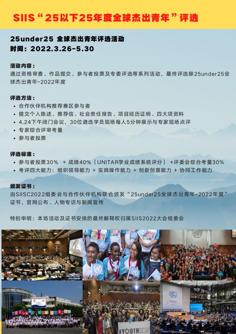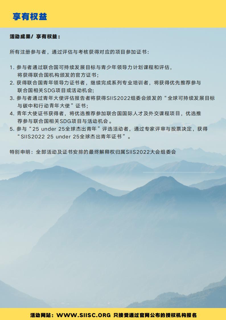 参加所有上述活动并通过顾问与导师委员会评估者,将同时获得联合国青年领导力证书与SIIS2022组委会颁发的SDG青年大使证书。SIISC2022组委会与合作伙伴机构还将从青年大使中评选出25位年度杰出青年,并颁发“全球杰出青年”证书,官网公布评选结果,获选者将接受人物专访与新闻宣传。