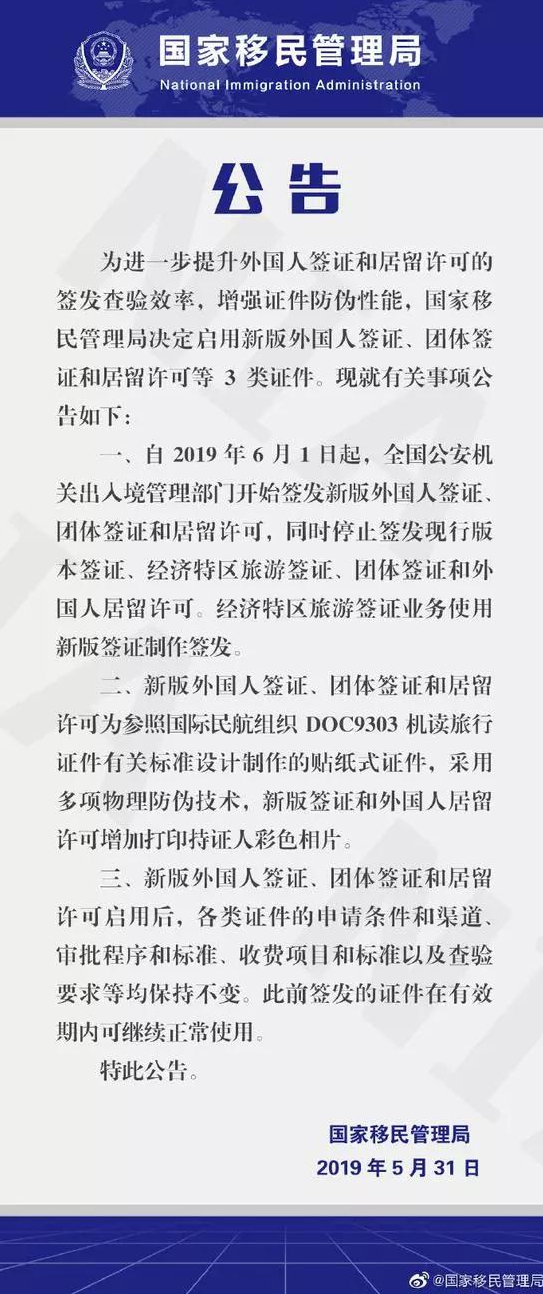 2019年5月31日,国家移民管理局还发布了相关公告,表示所有的新签证开始签发,也就是说,6月1日起,申请中国签证的小伙伴们,都可以拿到新版签证啦!