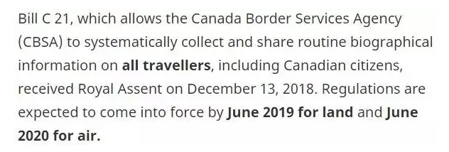 去年底,加拿大国会通过C-21法案,要求边境管理局(CBSA)收集出入境人士的资料。今年6月起,对陆路进出者生效。