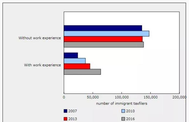 从2007年至2016年,新移民中,拥有加拿大工作经验的报税移民人数上涨了166%,而没有工作经验的移民仅增长了2%。