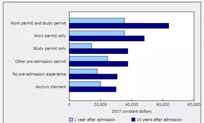 移民前曾持有学签和工签的2007年抵加的老移民,十年后的,工资提高到了$63,800,是所有移民中最高的。紧随其后的就是那些移民前持有工签的老移民,平均收入是$48,100。