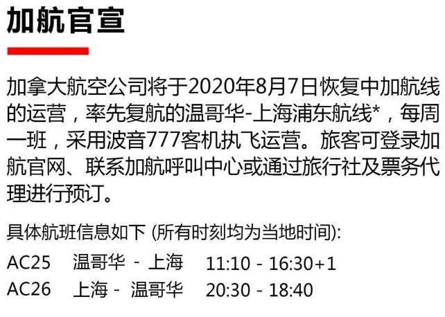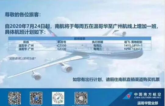 南方航空温哥华营业部也确认,在“五个一”的政策下,南航从7月24日开始,每周五增加一班温哥华直飞广州的航班。