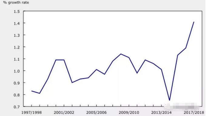 从人口增长率曲线来看,自2014年起,加拿大的人口增长就逐年提高,可以用飙升来形容。