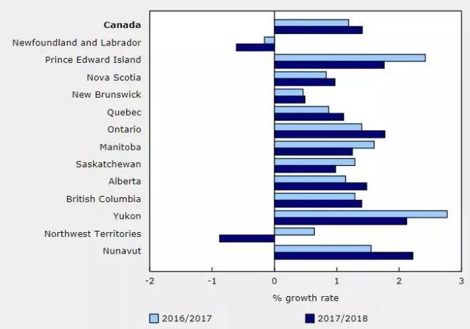 在2017/2018年,许多省份的人口增加主要来自移民的强劲增长,包括安省(+192,679)、魁省(+82,943)、新斯科舍省(+7,419)、卑诗省(+55,457)和育空(+429)。