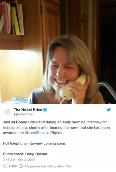 2018年, 唐娜.斯特里克兰(Donna Strickland)获得诺贝尔物理学奖。