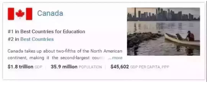 今年U.S.News World Report(美国新闻与世界报道)公布的“全球最好教育质量国家(Best Countries for Education) ”的评选结果,加拿大再次在80个国家中获得了第一名。在经合组织(OECD)的调查中,全球教育品质国家排名情况,加拿大同样名列第一。