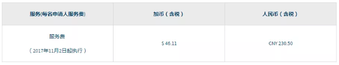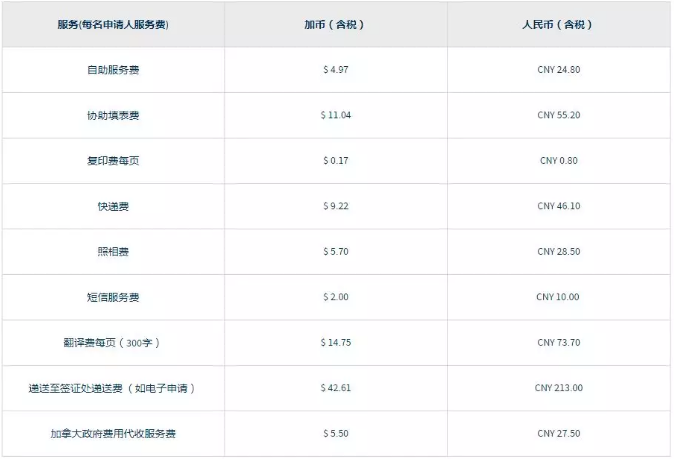 如果未在 IRCC网站上支付签证费用而选择经由签证中心或邮寄至签证中心一并提交申请,则需要另外支付以下列表中的加拿大政府费用代收服务费CNY 27.50元。