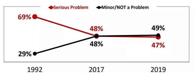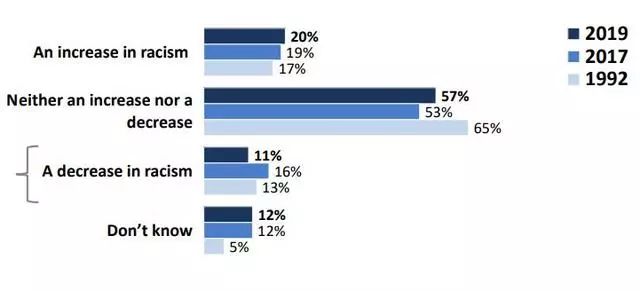 从时间线来看,1992年到2019年,认为种族主义严重的现象渐渐得到缓解,从1992年的69%降到了2019年的49%,2019年较2017年48%有轻微的上升;认为种族主义不值一提的态度渐渐上升,从1992年的29%涨至2019年47%,2019年又相较于2017年48%有所回落。