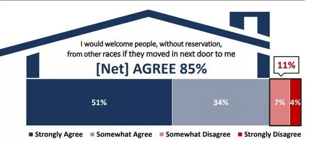 这项民意调查问了一个“是否能接受不同族裔的人士搬来做你邻居”的问题,调查结果与前期的种族主义是否严重的结果,背道而驰:有85%的受访者表示完全能够接受不同族裔的人搬来当邻居,仅仅11%表示不愿意。