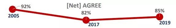 另外,这项调查从2005年到2019年是呈现一个波折反复的趋势,2005年有92%的受访者称毫无保留地欢不同族裔的人士来做邻居,而这比例在2017年下降至82%,在2019年又回升至85%。