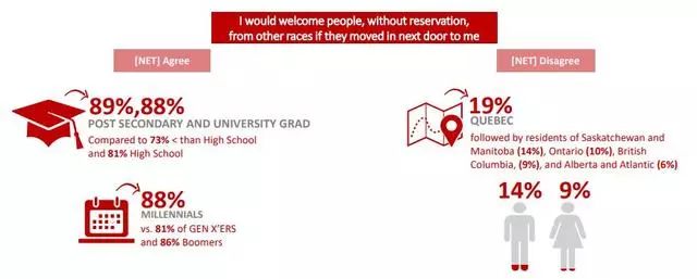 从身份来说,受过高等教育的加拿大人有88-89%以及千禧一代88%左右,更容易接受其他种族的邻居。然而,受访者位于在魁北克省有19%的和其中14%的男性和9%的女性,他们不太能容忍,因为他们更有可能表示不同意这一观点。