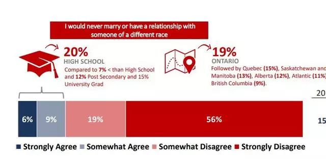 与往年一样,15%的加拿大人永远不会结婚,也不会与其他种族的人发生关系。只有高中学历的人大概有20%和安大略省居民19%更有可能认同这一观点。