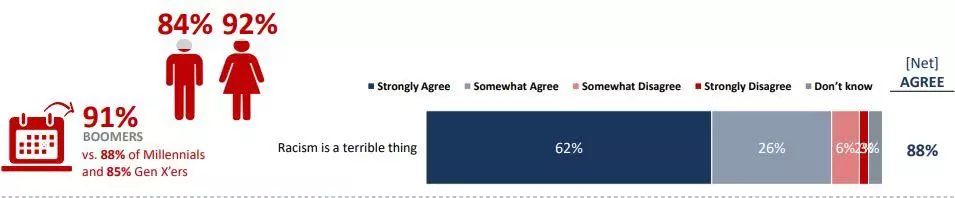但有趣的是,有92%女性更有可能同意种族主义是一件可怕的事情,而魁北克居民有54%承认,自己有不愿在公共场合谈论种族主义的想法。