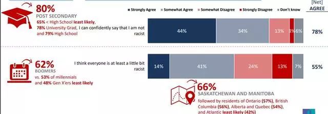 只有44%的人强烈同意自己不是种族主义者,但竟有超过四分之三的加拿大人可以自信地说他们不是,这表明大多数加拿大人存在一定程度的内省怀疑主义。