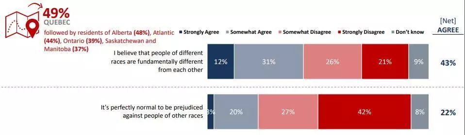超过四成的加拿大人认为不同种族的人本质上是不同的。而魁北克省有49%的人和阿尔伯塔省的48%居民最可能同意这一点。