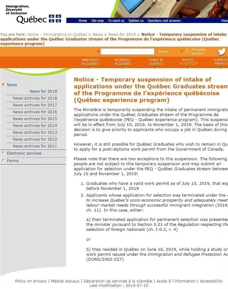 加拿时间2019年7月10日,省移民部长Simon Jolin-Barrette发布了一项新的部长指令:从2019年7月10至2019年11月1日期间,暂停接收留学类PEQ的申请!
