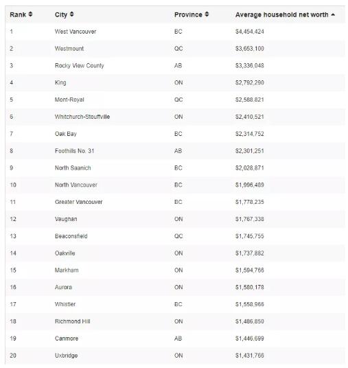 榜单中排名第二的是魁北克的Westmount富人区,家庭资产净值365万加元,卡尔加里的Rocky View County,以330万的家庭平均资产位居第三。