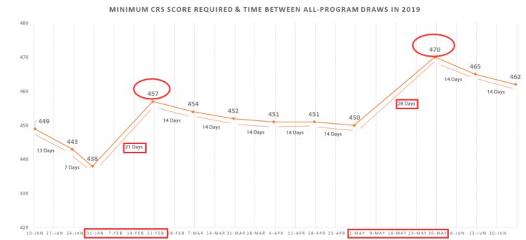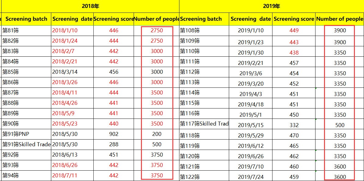 每次的EE筛选都有一个邀请分数,这是受邀申请人中最低的EE分数。也就是说所有得分高于这个分数的申请人都会收到联邦邀请函。上半年的筛选中,筛选分数从438的低分到470的高分,其中有1次技工类别的特定筛选,最低分为332分。