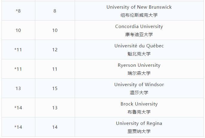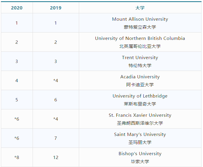 在基础类院校中,蒙特爱立森大学、北英属哥伦比亚大学和特伦特大学分列一二三位。莱斯布里奇大学此次冲进前五。