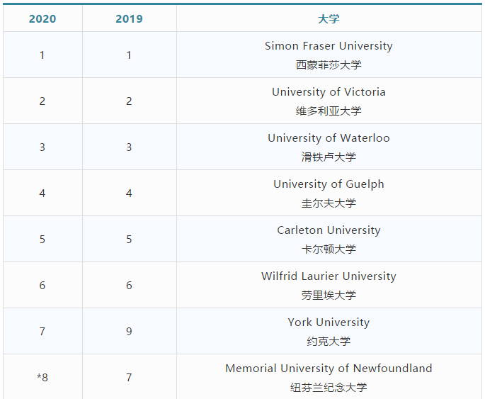 今年的综合类大学排名中,TOP 6 与2019年的排名完全一致。排名第1的依然是西蒙菲莎大学,维多利亚大学和滑铁卢大学紧随其后。