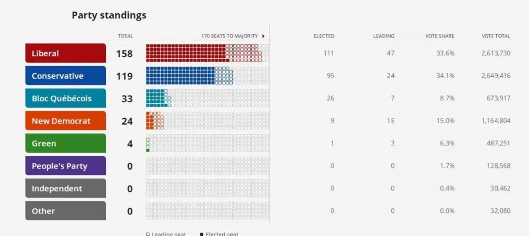 根据投票结果,在众议院338个席位中,现任总理特鲁多领导的自由党遥遥领先,获得158个席位,保守党获得119个席位。按照规定,组建多数政府需要170个席位。因此,特鲁多将组建多党执政的少数政府。
