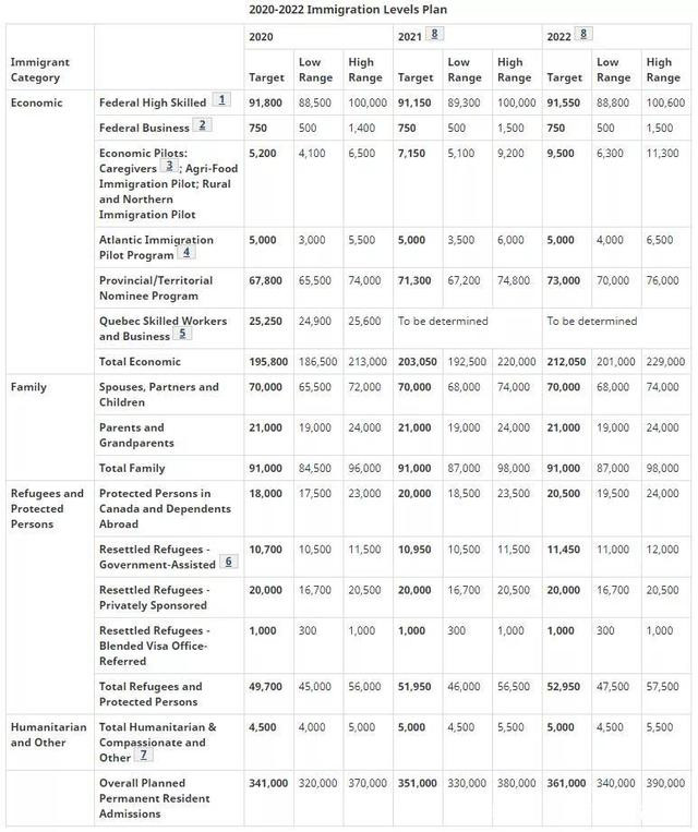 《计划》中提到,2018年加拿大接纳了32万移民,2019年接纳了34.1万移民,而接下来3年的移民目标分别是:
