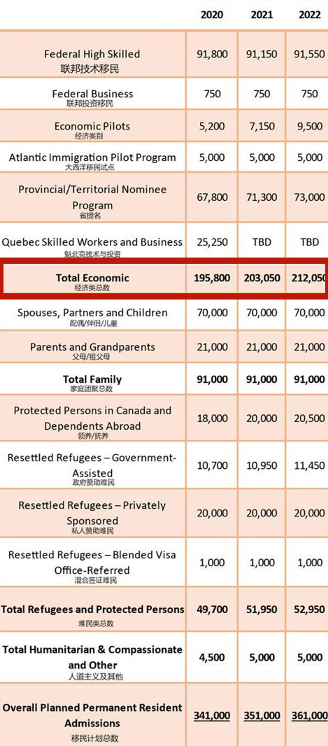 而在各类移民种类配额方面,经济类移民仍然是主导,占据2020年总移民数的近58%。并且,每年近10,000移民数量的增长,大部分也将会来自经济类别移民。