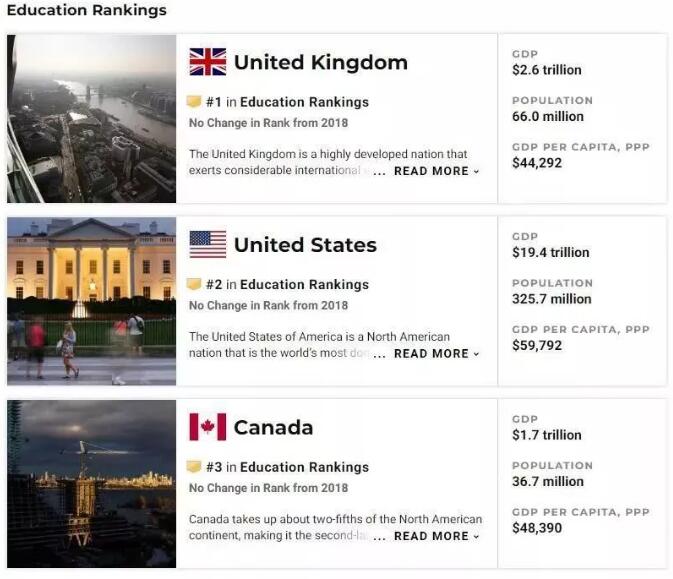 加拿大拥有世界一流的教育水平,在“2019年全球教育水准最高的国家”(Best Countries for Education)评选中位列第三!