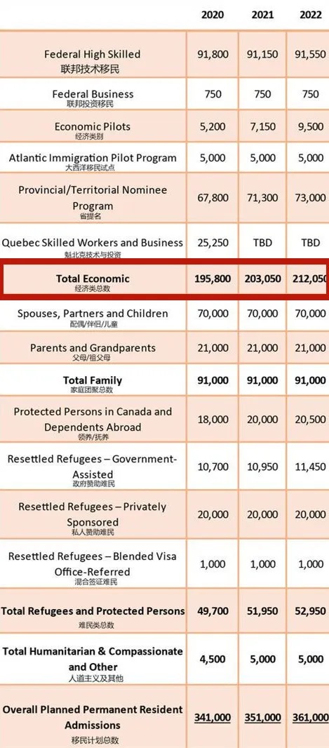 从图表中可以看出,在各类移民种类配额方面,经济类移民仍然是主导,占据2020年总移民数的近58%。并且,每年近10,000移民数量的增长,大部分也将会来自经济类别移民。