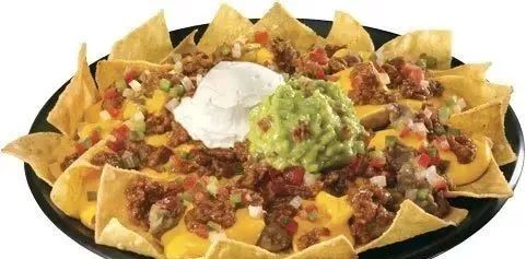Nachos原文应该是西班牙语,我找不到中文翻译,简单说就把类似辣椒、肉类等食材熬制进奶酪里,使奶酪保持在一个半融化的温度,然后浇在玉米片上的一种小吃,源自墨西哥,可以说是美国现在最流行的小吃。