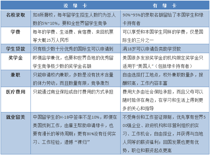 “而今,一张绿卡不只是进入美国名校的‘通行证’,中国也对其分外认同,北大、清华等国内高校,对于拥有绿卡的国际生,政策十分宽容,只要参加华侨联考,可以直降200分入读!”Steven先生讲到:“所以,对于人大附中那些‘国际生’来说,清华、北大是他们保底的选项。”