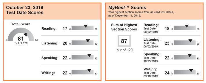 可以看出, 在2019年10月23日参加的托福考试中,A同学在阅读、听力、口语、写作四个单项成绩为17,20,22,22,总分为81分。而取他两年内过往三次托福考试的四个单项最高分:18,23,22,24,相加即得87分。