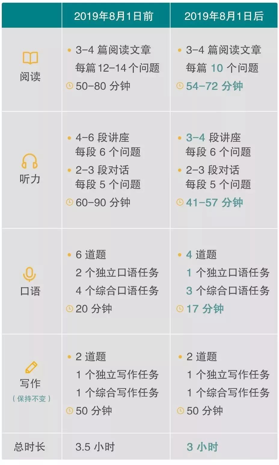 其中,阅读部分每篇文章的题目数量由12至14题改为10题,做题时长由60至80分钟减为54至72分钟;听力部分由4至6个讲座减为3至4个讲座,做题时长由60至90分钟减为41至57分钟;口语部分由6道题减为4道试题,其中1道独立口语,3道综合口语,做题时长由过去的20分钟减至17分钟;写作部分则保持不变。