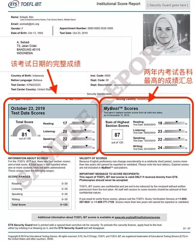 除了常规成绩外,考生收到的包含过去两年内听说读写四科的最佳成绩组合,称为MyBest Score,也称Super Score,也就是大家最近常常听到的托福拼分。根据官网介绍,考生可以从过去两年内的全部有效成绩中,选取听力、阅读、写作、口语四个单项的最高得分整合成最佳成绩组合。