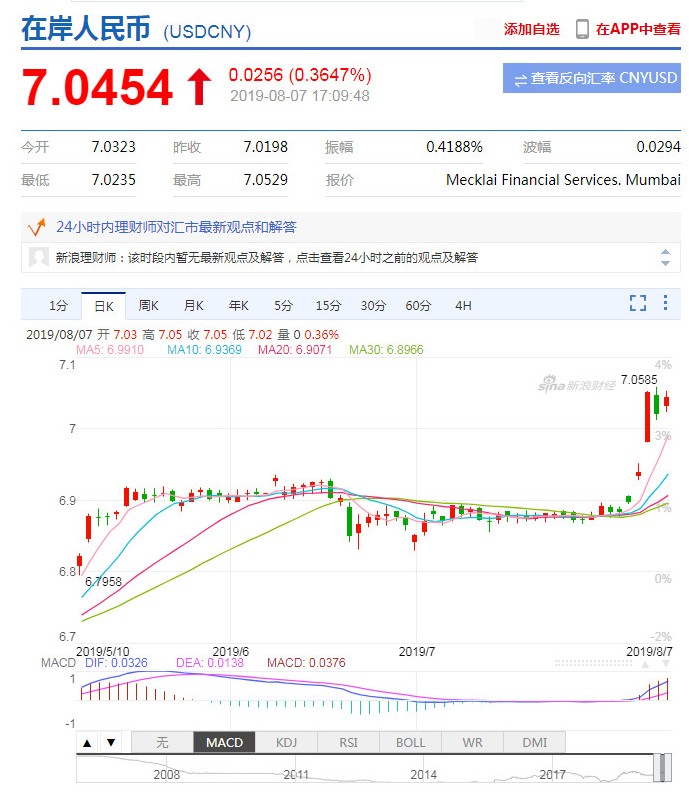2019年8月5日,人民币离岸和在岸汇率双双“破7”。这是2008年4月以来人民币兑美元的最低汇率。其中离岸人民币兑美元汇率在跌破7关口后,再度下跌至破7.1,最低报7.1068,下跌幅度近1000点。在岸人民币兑美元跟随下跌,汇率收盘价报7.0352。