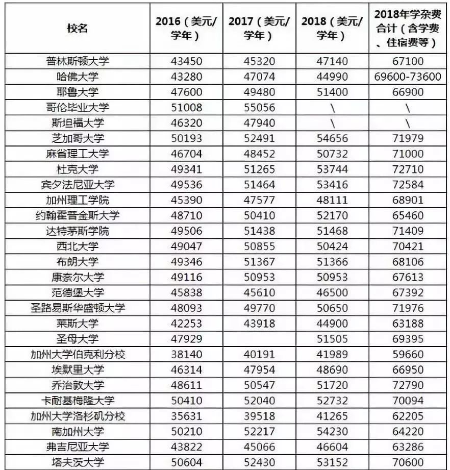 U.S.news曾对美国的近2000所大学的学费进行了统计,数据显示:美国大学2018-19年的学费平均上涨了3%,甚至有些学校的涨幅,超过了10%。大部分大学一年的学费已经突破50,000美元,而名校基本处于60,000美元以上的梯队。