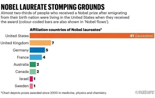 10月9日,《Nature》发布文章,指出在21世纪获得诺贝尔物理学奖、化学奖及生理学或医学奖的202位科学家中,超过30%是在他国完成研究并获得诺贝尔奖的移民人士,移民重塑诺贝尔奖版图。