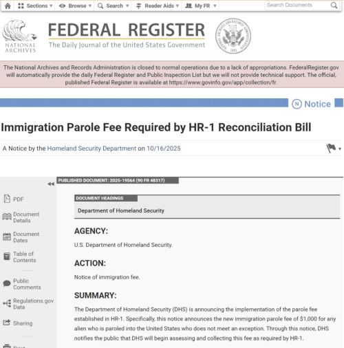 美国国土安全部(DHS)于10月16日正式在联邦公告网上公布,即日起对部分移民假释(Immigration Parole)申请加收1000美元的费用。这一措施是响应今年7月美国国会通过并由总统签署生效的“OBBB”法案(大而美法案)中涉及移民的新增费用条款。