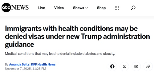近日,据美国广播公司 (ABC) 报道,当地时间上周四,特朗普政府已发布新的签证审理指南:患有糖尿病、肥胖症、心脏病等慢性疾病的外国申请人,可能因健康状况被拒签。该指令由美国国务院下发至各国使领馆,并已由凯撒家庭基金会健康新闻(KFF Health News)审阅确认。