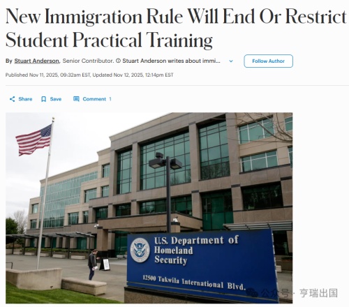 美拟出新规:OPT将被取消或严格限制。据Forbes 11月11日的报道,特朗普政府即将出台的一项新规预计将终止或限制国际学生的“选择性实习培训”(OPT)。这项移民法规已列入公开监管议程,可能在今年年底前或 2026 年上半年出台。