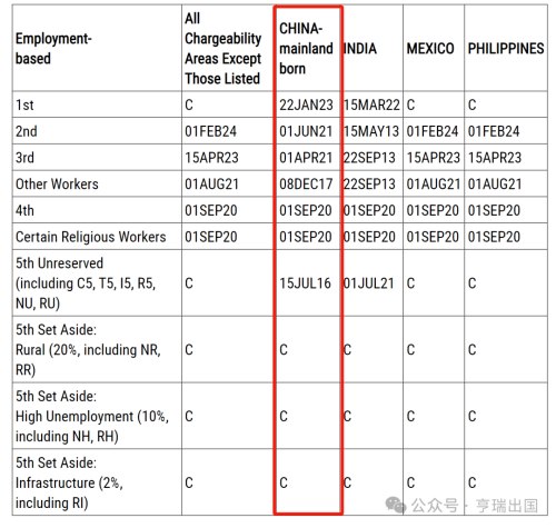 可喜的是,EB-5非预留出现220天的大幅前进,表B排期也小幅前进21天。EB-5新政继续保持无排期。而中国大陆职业移民表A也表现喜人,EB-1、EB-2、EB-3、EB-4 都有1到2个月幅度的前进,表B无变化。一起来看: