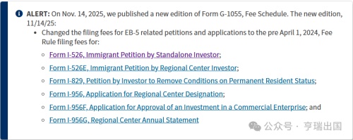 自 2025 年 11 月 14 日 起,美国移民局(USCIS)正式恢复 2024 年 4 月 1 日之前的 EB-5 旧收费标准。