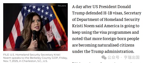 美国《经济时报》The Economic Times 11月13日报道,在特朗普刚刚公开强调国际留学生对美国大学“至关重要”,“国际生如果减少一半,美国一半大学会倒闭”的第二天,国土安全部部长Kristi Noem在接受媒体专访时被问到政府对 H-1B 签证的立场是什么。