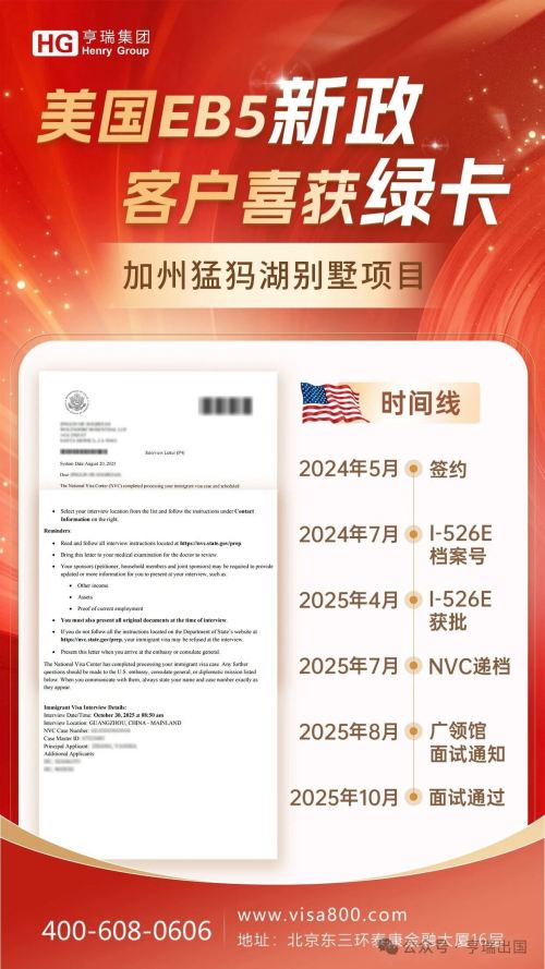 今年亨瑞集团有将近300位客户通过80万美元投资移民项目,两年内喜提绿卡。