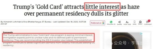 据印度《经济时报》当地时间12月18日报道,特朗普政府开放“金卡”签证申请近一周后,热度远未达到预期,移民专家表示,金卡申请指南和相关法律条文含糊不清,且没有明确的永久居留权或公民身份途径,即使对富裕的印度人来说也缺乏吸引力。他们建议申请人转而选择EB-5类别。