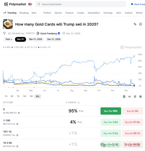 美国预测市场也明显感受到人们对金卡计划的质疑。在Polymarket平台上,关于“特朗普政府在 2025 年将出售多少金卡”的“真金白银投票”显示: