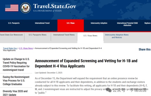 H1-B签证预约出现延误的起因是:美国国务院12月3日宣布,自15日起,社交媒体审查范围从原有的留学生和交流访问学者群体(F、M 和 J 签证),扩大至H-1B及其家属(H-4签证)。