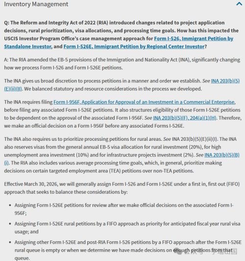 3.其他类别顺序: 只有在乡村项目队列清空,或者 USCIS 认为已处理了足够数量的乡村项目申请后,才会开始按“先进先出”原则审核其他 I-526E 和 RIA 法案后的 I-526 申请。